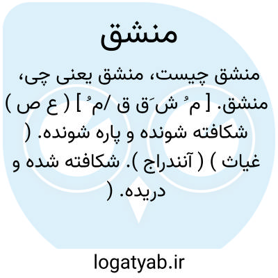 منشق. [ م ُ ش َق ق /م ُ ] ( ع ص ) شکافته شونده و پاره شونده. ( غیاث ) ( آنندراج ). شکافته شده و دریده. ( ناظم الاطباء ). شکافتن. چاک. دوپاره. پاره. ( یادداشت مرحوم دهخدا ):
