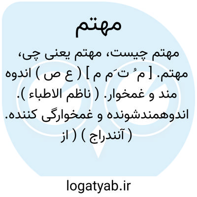 مهتم. [ م ُ ت َم م ] ( ع ص ) اندوه مند و غمخوار. ( ناظم الاطباء ). اندوهمندشونده و غمخوارگی کننده. ( آنندراج ) ( از منتهی الارب ). و رجوع به اهتمام شود.
