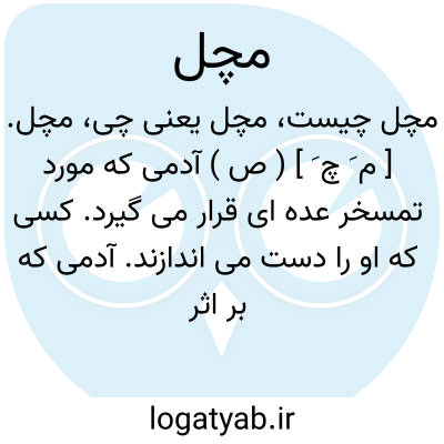 مچل. [ م َ چ َ ] ( ص ) آدمی که مورد تمسخر عده ای قرار می گیرد. کسی که او را دست می اندازند. آدمی که بر اثر شوخی دیگران اوقاتش تلخ شده و از کوره دررفته است: این یارو مچل خوبی است. یا دیشب فلانی را مچل کردیم. ( فرهنگ لغات عامیانه جمال زاده ). || ( اِ ) خوراکی و تنقلی است که در هنگام کشیدن تریاک و شیره می خورند و در این صورت در برابر «مزه » است برای عرق خوران. ( فرهنگ لغات عامیانه جمال زاده ).