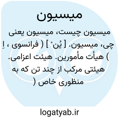 میسیون. [ یُن ْ ] ( فرانسوی، اِ ) هیأت مأمورین. هیئت اعزامی. هیئتی مرکب از چند تن که به منظوری خاص ( تبلیغات مذهبی، امور سیاسی، فرهنگی و غیره ) به جایی اعزام شوند: میسیون نظامی. || مأموریت. فرستادگی. اعزام. نمایندگی. || مأموریت موقتی و معین از طرف دولت. || مأموریت برای مطلع ساختن مردم از مسائل دینی.