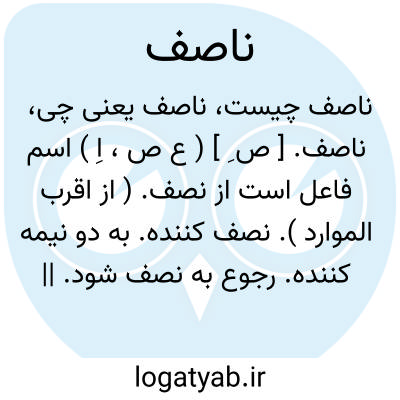 ناصف. [ ص ِ ] ( ع ص، اِ ) اسم فاعل است از نصف. ( از اقرب الموارد ). نصف کننده. به دو نیمه کننده. رجوع به نصف شود. || چاکر. ( منتهی الارب ) ( آنندراج ). خدمتکار. ( مهذب الاسماء ). چاکر و خدمتکار. ( ناظم الاطباء ). خادم. ( اقرب الموارد ) ( از المنجد ). ج، نصف [ ن َ ص َ ]، نصفة [ ن َ ص َ ف َ ]، نصاف [ ن ُ ص صا ].