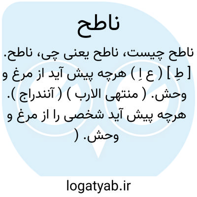 ناطح. [ طِ ] ( ع اِ ) هرچه پیش آید از مرغ و وحش. ( منتهی الارب ) ( آنندراج ). هرچه پیش آید شخصی را از مرغ و وحش. ( ناظم الاطباء ). مقابل قعید. آنچه از وحش و طیر که از پیش روی تو درآید. ( از اقرب الموارد ) ( از المنجد ). مایستقبلک من امامک من الطیر و الظباء و الوحش و غیرها مما یزجر. ( معجم متن اللغة ). || گوسپند. کبش. عنز. ( اقرب الموارد ). یقال: ما له ناطح و لا خابط؛ یعنی او را نه گوسپندیست و نه شتری. ( منتهی الارب ) ( ناظم الاطباء ) ( آنندراج ) ( از معجم متن اللغة ). ای لا شی له، او را چیزی نیست. ( از اقرب الموارد ) ( المنجد ). || رنج. سختی. ( آنندراج ). یقال: اصابه ناطح من الدهر؛ ای امر شدید. ( منتهی الارب ). رنج. سختی. شدت. ( ناظم الاطباء ). امر شدید پرمشقت. ( معجم متن اللغة ). ج، نواطح.
