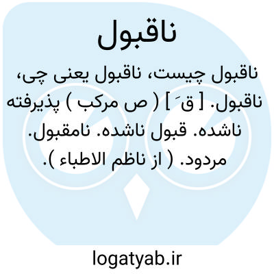 ناقبول. [ ق َ ] ( ص مرکب ) پذیرفته ناشده. قبول ناشده. نامقبول. مردود. ( از ناظم الاطباء ). نامقبول. ناپسندیده. ( آنندراج ). || نفرت و کراهت داشته شده. ( ناظم الاطباء ). || ( ق مرکب ) قبول نکرده. ناپذیرفته. پیش از آنکه قبول کنند: