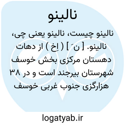 نالینو. [ ن َ ] ( اِخ ) از دهات دهستان مرکزی بخش خوسف شهرستان بیرجند است و در 38 هزارگزی جنوب غربی خوسف، در منطقه کوهستانی گرمسیری واقع است و 19 تن سکنه دارد. آبش از قنات تأمین میشود. محصولش غلات و شغل اهالی زراعت است.راه مالرو دارد. ( از فرهنگ جغرافیایی ایران ج 9 ).