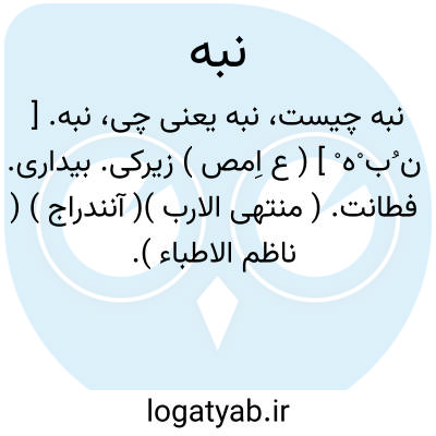 نبه. [ ن ُب ْه ْ ] ( ع اِمص ) زیرکی. بیداری. فطانت. ( منتهی الارب )( آنندراج ) ( ناظم الاطباء ). نباهت. فطنت. ضد خمول. ( از معجم متن اللغة ). فطنة. ( المنجد ). || ( مص ) یادآوری فراموش شده را. ( منتهی الارب ) ( آنندراج ) ( ناظم الاطباء ). || برخاستن از خواب. ( از معجم متن اللغة ) ( از اقرب الموارد ). بیدار شدن. ( از اقرب الموارد ) ( از المنجد ). نباهت. ( معجم متن اللغة ).