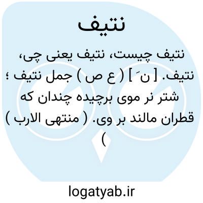 نتیف. [ ن َ ] ( ع ص ) جمل نتیف؛ شتر نر موی برچیده چندان که قطران مالند بر وی. ( منتهی الارب ) ( آنندراج ) ( از اقرب الموارد ). شتر نر موی ریخته یا موی برچیده جهت قطران مالیدن. ( ناظم الاطباء ).