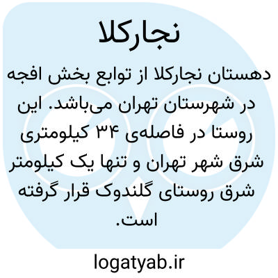 نجارکلا. [ ن َج ْ جا ک َ ] ( اِخ ) ده مرکزی بخش افجه شهرستان تهران است، در 34 هزارگزی مشرق تهران و یک هزارگزی مشرق گلندوک واقع است و 250 تن سکنه دارد. آبش از رودخانه کندرود، محصولش غلات و بنشن و میوه ها، شغل اهالی زراعت و کرباس بافی است. ( از فرهنگ جغرافیائی ایران ج 1 ).