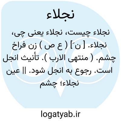 نجلاء. [ ن َ] ( ع ص ) زن فراخ چشم. ( منتهی الارب ). تأنیث انجل است. رجوع به انجل شود. || عین نجلاء؛ چشم فراخ. ( منتهی الارب ) ( ناظم الاطباء ). چشمی فراخ بزرگ. ( مهذب الاسماء ). || طعنة نجلاء؛ زخم نیزه فراخ. ( ناظم الاطباء ). طعنه فراخ جراحت. ( مهذب الاسماء ).