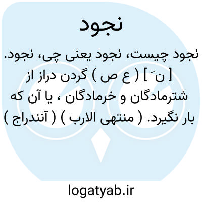 نجود. [ ن َ ] ( ع ص ) گردن دراز از شترمادگان و خرمادگان، یا آن که بار نگیرد. ( منتهی الارب ) ( آنندراج ) ( از اقرب الموارد ). گردن دراز از ماده شتر و ماده خر، و آنکه باردار نشود. ( ناظم الاطباء ). || ناقه درگذرنده و پیشی گیرنده. ( از منتهی الارب )( آنندراج ) ( از المنجد ). ماده شتر درگذرنده و پیشی گیرنده. ( ناظم الاطباء ). قیل: الناقة الماضیة، و قیل: المتقدمة. ( اقرب الموارد ). || ناقه بسیارشیر. ( از منتهی الارب ) ( آنندراج ). مغزار. ( اقرب الموارد ). || ناقه که در جای بلند خواب کند. ( منتهی الارب ) ( آنندراج ) ( از اقرب الموارد ). || ناقه که چون با شتران بسیارشیر گردد چون دیگران بسیارشیر شود. ( منتهی الارب ) ( آنندراج ). ماده شتری که چون با شتران باشد هرگاه دیگران بسیارشیر شوند شیر وی نیز فراوان گردد. ( ناظم الاطباء ) ( از اقرب الموارد ). || زن عاقله شگرف. ( منتهی الارب ) ( آنندراج ).زن عاقله نبیله. ( اقرب الموارد ). زن دانشمند عاقل شگرف. ( ناظم الاطباء ). نبیلة. عاقلة. ( المنجد ). ج، نُجُد. || ( اِ ) خون. ( المنجد ). ج، نواجید.