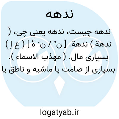 ( ندهة ) ندهة. [ ن ُ / ن َ هََ ] ( ع اِ ) بسیاری مال. ( مهذب الاسماء ). بسیاری از صامت یا ماشیه و ناطق یا بیست از گوسفند و مانند آن و صد از شتر و هزار از صامت. ( منتهی الارب ) ( آنندراج ). مال بسیاری از صامت و گفته اند آن بیست گوسفند و امثال آن است و صد شتر و هزار صامت و مانند آن. ( از اقرب الموارد ) ( ناظم الاطباء ).