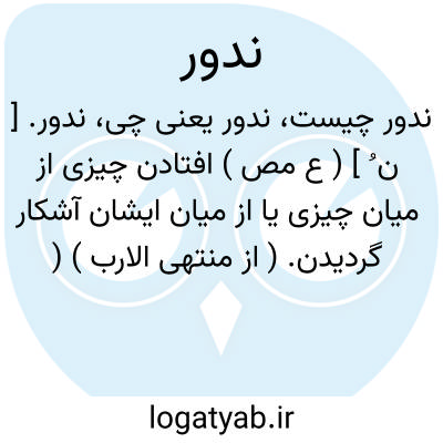 ندور. [ ن ُ ] ( ع مص ) افتادن چیزی از میان چیزی یا از میان ایشان آشکار گردیدن. ( از منتهی الارب ) ( آنندراج ) ( از اقرب الموارد ). || افتادن. ( منتهی الارب ) ( آنندراج ). سقوط. ( یادداشت مؤلف ). || مردن. || آزمودن. || تیز دادن. || برگ برآوردن گیاه و برگ برآوردن درخت یا سبز شدن آن. ( منتهی الارب ) ( آنندراج ) ( ناظم الاطباء ) ( از اقرب الموارد ). || برآمدن. ( منتهی الارب ) ( آنندراج ). || بیرون آمدن شخص از میان قومش. || بیرون آمدن استخوان از محل خود. ( از اقرب الموارد ) ( از ناظم الاطباء ). || تنها و غریب شدن. ( منتهی الارب ) ( آنندراج ) ( ناظم الاطباء ). || کمیاب شدن. ندر. ( از اقرب الموارد ). و اسم از آن ندرة [ ن َ / ن ُ رَ ] است. ( از اقرب الموارد ). || پیشی گرفتن در علم و فضل.( از اقرب الموارد ). پیشی گرفتن در فضیلت. ( ناظم الاطباء ). در اقرب الموارد و المنجد آمده است: نَدَرَ نَدْراً و نُدوراً به تمام معانی مذکور در فوق، اما درمنتهی الارب و به نقل از آن در آنندراج و ناظم الاطباء تنها مصدر ندور ذکر شده است. رجوع به نَدْر شود.