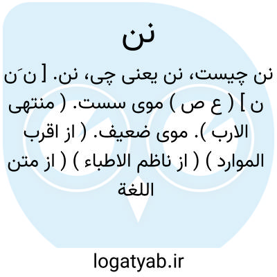 نن. [ ن َن ن ] ( ع ص ) موی سست. ( منتهی الارب ). موی ضعیف. ( از اقرب الموارد ) ( از ناظم الاطباء ) ( از متن اللغة ).