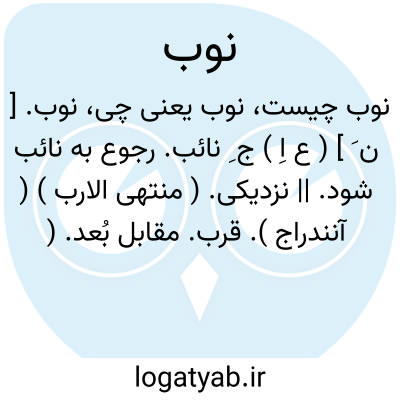 نوب. [ ن َ ] ( ع اِ ) ج ِ نائب. رجوع به نائب شود. || نزدیکی. ( منتهی الارب ) ( آنندراج ). قرب. مقابل بُعد. ( از اقرب الموارد ) ( از متن اللغة ). || آن که بر مسافت یک شباروز باشد. ( منتهی الارب ) ( آنندراج ). و رجوع به اقرب الموارد و متن اللغة شود. || قوّت. توانائی. ( منتهی الارب ) ( آنندراج ) ( از اقرب الموارد ) ( از متن اللغة ). || ( مص ) بر جای کسی ایستادن و قائم مقام او شدن. ( از منتهی الارب ) ( از آنندراج ). نیابة. ( از ناظم الاطباء ) ( متن اللغة ). مناب. ( اقرب الموارد ) ( منتهی الارب ). نیاب. ( اقرب الموارد ) ( المنجد ). || بازگشتن از گناه. ( از منتهی الارب ) ( از آنندراج ). مناب. ( اقرب الموارد ) ( منتهی الارب ). نیاب. ( اقرب الموارد ) ( المنجد ). || لازم گرفتن بندگی را. ( از منتهی الارب ) ( آنندراج ). لازم گرفتن بندگی و طاعت را. ( ناظم الاطباء ) ( از اقرب الموارد ). توبه کردن و ملازم طاعت شدن. ( از متن اللغة ). || فرودآمدن کاری. ( منتهی الارب ). کسی را کاری رسیدن. ( تاج المصادر بیهقی ). نوبة. ( منتهی الارب ) ( اقرب الموارد ) ( متن اللغة ).