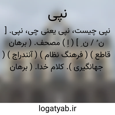 نپی. [ ن ُ / ن ِ ] ( اِ ) مصحف. ( برهان قاطع ) ( فرهنگ نظام ) ( آنندراج ) ( جهانگیری ). کلام خدا. ( برهان قاطع ) ( آنندراج ). قرآن. ( فرهنگ نظام ). نُبی. نُوی. رجوع به نُبی و نوی شود.