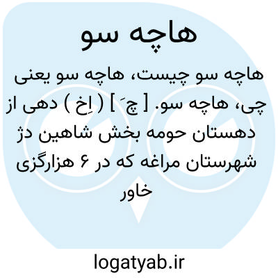 هاچه سو. [ چ َ ] ( اِخ ) دهی از دهستان حومه بخش شاهین دژ شهرستان مراغه که در 6 هزارگزی خاور شاهین دژ و 5هزارگزی شمال خاوری ارابه رو شاهین دژ به تکاب واقع شده است. سرزمینی کوهستانی و هوای آن معتدل است. 938 تن سکنه دارد که به زراعت و گله داری و از صنایع دستی به جاجیم بافی اشتغال دارند. از چشمه سارها مشروب میشود و محصولات عمده اش غلات، حبوبات، کشمش، بادام و کرچک میباشد. دبستان چهارکلاسه ای دارد و راهش مالرو است. ( از فرهنگ جغرافیایی ایران ج 4 ).