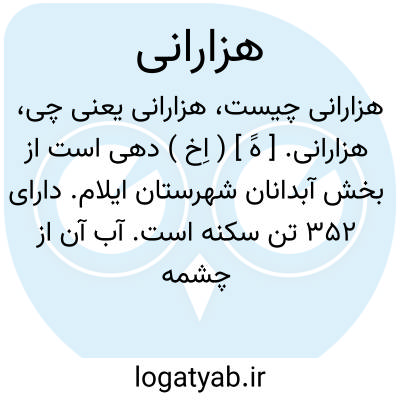 هزارانی. [ هََ ] ( اِخ ) دهی است از بخش آبدانان شهرستان ایلام. دارای 352 تن سکنه است. آب آن از چشمه و رودخانه کبود است و محصول آن غله، لبنیات، پشم و ماش است. ( از فرهنگ جغرافیائی ایران ج 5 ).