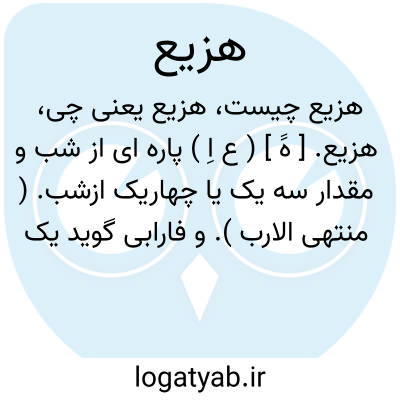 هزیع. [ هََ ] ( ع اِ ) پاره ای از شب و مقدار سه یک یا چهاریک ازشب. ( منتهی الارب ). و فارابی گوید یک نیمه از شب، و گویند ساعتی از آن. گویند: مضی هزیع من اللیل. ( اقرب الموارد ). || ( ص ) مرد گول. ( منتهی الارب ).احمق. ( اقرب الموارد ). ج، هُزُع. ( اقرب الموارد ).