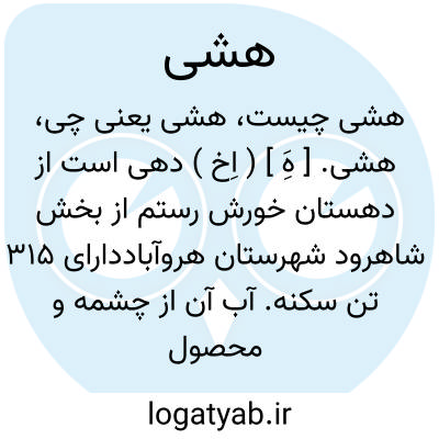 هشی. [ هَِ ] ( اِخ ) دهی است از دهستان خورش رستم از بخش شاهرود شهرستان هروآباددارای 315 تن سکنه. آب آن از چشمه و محصول عمده اش غله و سردرختی است. ( از فرهنگ جغرافیائی ایران ج 4 ).