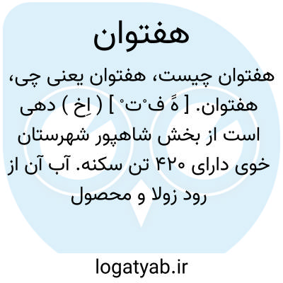 هفتوان. [ هََ ف ْت ْ ] ( اِخ ) دهی است از بخش شاهپور شهرستان خوی دارای 420 تن سکنه. آب آن از رود زولا و محصول عمده اش غله و حبوب است. ( از فرهنگ جغرافیائی ایران ج 4 ).