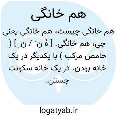 هم خانگی. [ هََ ن َ / ن ِ ] ( حامص مرکب ) با یکدیگر در یک خانه بودن. در یک خانه سکونت جستن. همنشینی: شهنشه پذیرا شد آن خانه را به همخانگی برد فرزانه را.نظامی روا دارد ازدوست بیگانگی که دشمن گزیند به همخانگی.سعدی. || دوستی: با دو حکیم از سر همخانگی شد سخنی چند ز بیگانگی.نظامی.رجوع به هم خانه شود.