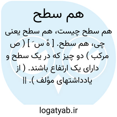 هم سطح. [ هََ س َ ] ( ص مرکب ) دو چیز که در یک سطح و دارای یک ارتفاع باشند. ( از یادداشتهای مؤلف ). || در تداول، کنایه از دو تن که رشد معنوی و فکری آنها برابر است.