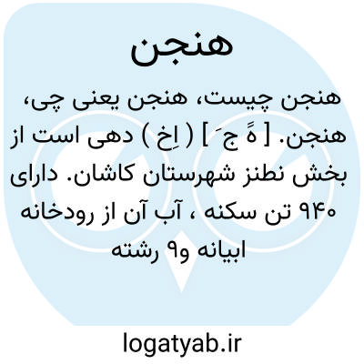هنجن. [ هََ ج َ ] ( اِخ ) دهی است از بخش نطنز شهرستان کاشان. دارای 940 تن سکنه، آب آن از رودخانه ابیانه و9 رشته قنات، محصول عمده اش غله، حبوب، انار، انجیر،سیب و کار دستی زنان گیوه بافی است. قلعه خرابه ای از آثار قدیم دارد. ( از فرهنگ جغرافیایی ایران ج 3 ).