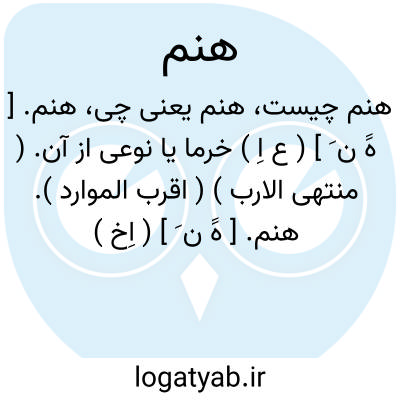 هنم. [ هََ ن َ ] ( ع اِ ) خرما یا نوعی از آن. ( منتهی الارب ) ( اقرب الموارد ). هنم. [ هََ ن َ ] ( اِخ ) دهی است از بخش پاپی شهرستان خرم آباد. دارای 160 تن سکنه، آب آن از چشمه و محصول عمده اش غله و لبنیات است و ساکنان آنجا از طایفه پاپی هستند. ( از فرهنگ جغرافیایی ایران ج 6 ).