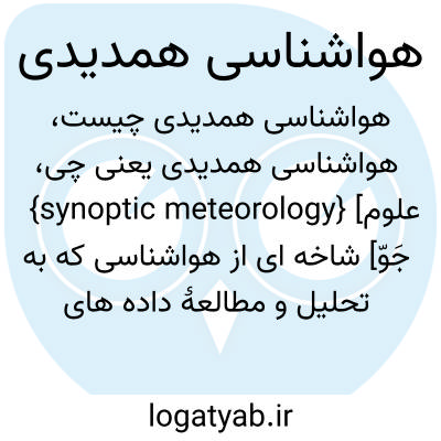 {synoptic meteorology} [علوم جَوّ] شاخه ای از هواشناسی که به تحلیل و مطالعۀ داده های جوّی هم زمان گردآوری شده از منطقه ای وسیع می پردازد