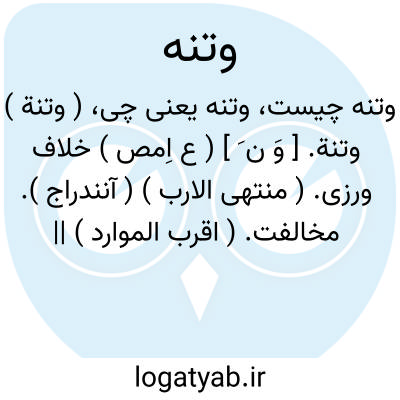 ( وتنة ) وتنة. [ وَ ن َ ] ( ع اِمص ) خلاف ورزی. ( منتهی الارب ) ( آنندراج ). مخالفت. ( اقرب الموارد ) || ملازمةالغریم. ( المنجد ) ( از اقرب الموارد ).