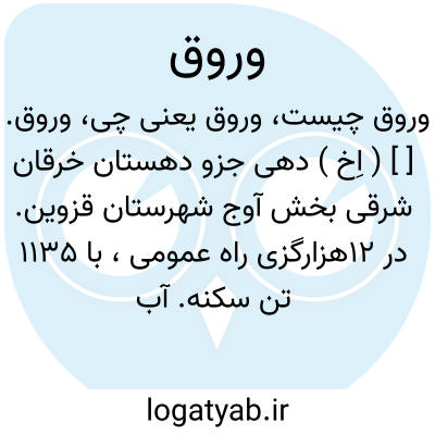 وروق. [ ] ( اِخ ) دهی جزو دهستان خرقان شرقی بخش آوج شهرستان قزوین. در 12هزارگزی راه عمومی، با 1135 تن سکنه. آب آن از چشمه سار تأمین می شود. محصول آنجا غلات، بنشن، باغات انگور، بادام، قیسی و عسل است و شغل اهالی زراعت و قالی و جاجیم بافی است. ( از فرهنگ جغرافیایی ایران ج 1 ).