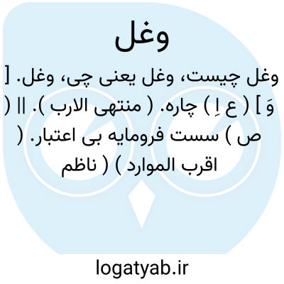 وغل. [ وَ ] ( ع اِ ) چاره. ( منتهی الارب ). || ( ص ) سست فرومایه بی اعتبار. ( اقرب الموارد ) ( ناظم الاطباء ) ( منتهی الارب ) ( آنندراج ). || ناخوانده در مجلس طعام و شراب کسی درآینده. || سستی کننده در هر چیزی. ( منتهی الارب ) ( آنندراج ) ( ناظم الاطباء ). || درخت درهم پیچیده. || دانه تلخه گندم که کبوتر خورد. || به دروغ دعوی نسب کننده. ( منتهی الارب ) ( آنندراج ) ( ناظم الاطباء ) ( اقرب الموارد ). || مرد بدخورش. ( منتهی الارب ). || ( اِ ) شراب که واغل خورد. ( منتهی الارب ) ( اقرب الموارد ) ( آنندراج ). شراب که شخص ناخوانده میخورد. ( ناظم الاطباء ). || پناه جای. ( منتهی الارب ) ( آنندراج ). پناه و ملجاء. ( ناظم الاطباء ).