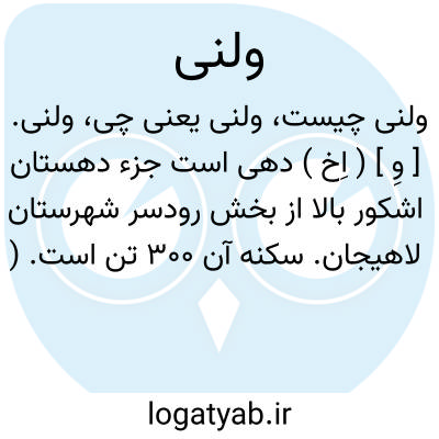 ولنی. [ وِ ] ( اِخ ) دهی است جزء دهستان اشکور بالا از بخش رودسر شهرستان لاهیجان. سکنه آن 300 تن است. ( فرهنگ جغرافیایی ایران ج 2 ).