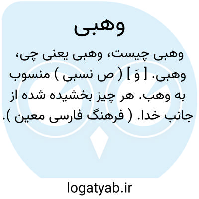 وهبی. [ وَ ] ( ص نسبی ) منسوب به وهب. هر چیز بخشیده شده از جانب خدا. ( فرهنگ فارسی معین ).