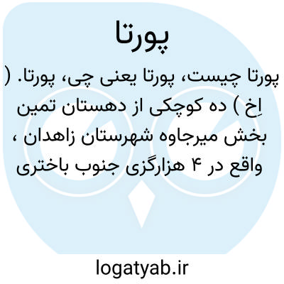 پورتا. ( اِخ ) ده کوچکی از دهستان تمین بخش میرجاوه شهرستان زاهدان، واقع در 4 هزارگزی جنوب باختری میرجاوه و 12 هزارگزی باختر راه فرعی میرجاوه به خاش. دارای 25 تن سکنه. ( از فرهنگ جغرافیائی ایران ج 8 ).
