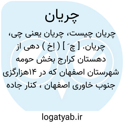 چریان. [ چ َ ] ( اِخ ) دهی از دهستان کرارج بخش حومه شهرستان اصفهان که در 14هزارگزی جنوب خاوری اصفهان، کنار جاده کرارج به براگون واقع است. جلگه و معتدل است و 642 تن سکنه دارد. آبش از رودخانه و چاه، محصولش غلات، صیفی، ذرت و پنبه، شغل اهالی زراعت و راهش ماشین رو است. این آبادی دارای مسجدی قدیمی است. ( از فرهنگ جغرافیایی ایران ج 10 ).