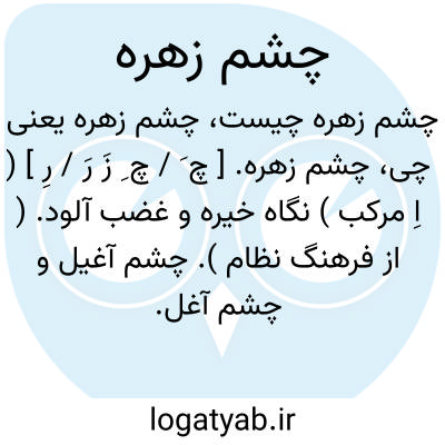 چشم زهره. [ چ َ / چ ِ زَ رَ / رِ ] ( اِ مرکب ) نگاه خیره و غضب آلود. ( از فرهنگ نظام ). چشم آغیل و چشم آغل. چشم غره. رجوع به چشم زهره رفتن شود.