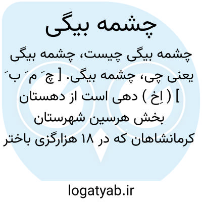 چشمه بیگی. [ چ َ م َ ب َ ] ( اِخ ) دهی است از دهستان بخش هرسین شهرستان کرمانشاهان که در 18 هزارگزی باختر هرسین و 5 هزارگزی جنوب شهر هرسین به کرمانشاهان واقع است. دشت و سردسیر است و 79 تن سکنه دارد. آبش از رودخانه. محصولش غلات، پنبه و حبوبات و راهش مالرو است و در تابستان با اتومبیل هم میتوان رفت. ( از فرهنگ جغرافیایی ایران ج 5 ).