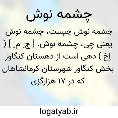 چشمه نوش. [ چ ِ م ِ ] ( اِخ ) دهی است از دهستان کنگاور بخش کنگاور شهرستان کرمانشاهان که در 17 هزارگزی شمال خاوری کنگاور و 6 هزارگزی خاور شوسه کرمانشاه بهمدان واقع است. دشت و معتدل است و 185 تن سکنه دارد. آبش از قنات. محصولش غلات دیمی و آبی،تریاک و حبوبات. شغل اهالی زراعت و راهش مالرو است. ( از فرهنگ جغرافیایی ایران ج 5 ).، چشمه نوش. [ چ َ م َ/ م ِ ی ِ ] ( ترکیب اضافی، اِ مرکب ) کنایه از آب حیات است. ( انجمن آرا ) ( آنندراج ). آب حیات. ( ناظم الاطباء ). و رجوع به چشمه حیوان و چشمه خضر و چشمه نوربخش شود. || کنایه از دهان معشوق است. ( انجمن آرا ) ( آنندراج ). دهان معشوق. ( ناظم الاطباء ). و رجوع به چشمه حیوان و چشمه خضر و چشمه نوربخش شود.