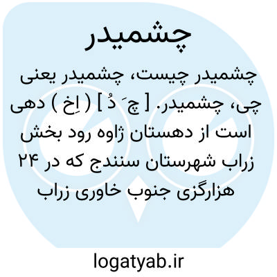 چشمیدر. [ چ َ دُ ] ( اِخ ) دهی است از دهستان ژاوه رود بخش زراب شهرستان سنندج که در 24 هزارگزی جنوب خاوری زراب و 8 هزارگزی شمال باختری بایگلان واقع است. کوهستانی و سردسیراست و 700 تن سکنه دارد. آبش از رودخانه بایگلان و چشمه. محصولش غلات، توتون،پنبه، لبنیات و میوه جات. شغل اهالی زراعت و گله داری، صنایع دستی زنان گلیم بافی و راهش مالرو است. ( از فرهنگ جغرافیایی ایران ج 5 ).