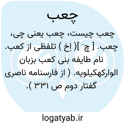 چعب. [ چ َ ]( اِخ ) تلفظی از کعب. نام طایفه بنی کعب بزبان الوارکهکیلویه. ( از فارسنامه ناصری گفتار دوم ص 331 ).