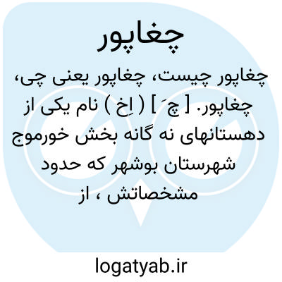 چغاپور. [ چ َ ] ( اِخ ) نام یکی از دهستانهای نه گانه بخش خورموج شهرستان بوشهر که حدود مشخصاتش، از شمال دهستان حومه خورموج و کوه خاک، از جنوب دهستان لاواکیکان، از باختر ارتفاعات مند و از خاور رودخانه مند میباشد. این دهستان که جلگه است و در دامنه واقع شده تقریباً در مرکز بخش قرار دارد. هوای آن گرم است. زراعتش بطور کلی دیمی است و آب مشروب اهالی از چاه تأمین میشود. محصول این آبادی عبارت از خرما و کمی غله است و شغل اهالی زراعت میباشد این دهستان از 12 آبادی تشکیل شده که در حدود 3800 تن سکنه دارد. قریه های مهم این دهستان عبارتند از: گزدراز، طویل دراز، فقیه احمدان، دهداوی و ناصری و چغاپور مرکز این همه است. ( از فرهنگ جغرافیایی ایران ج 7 ).