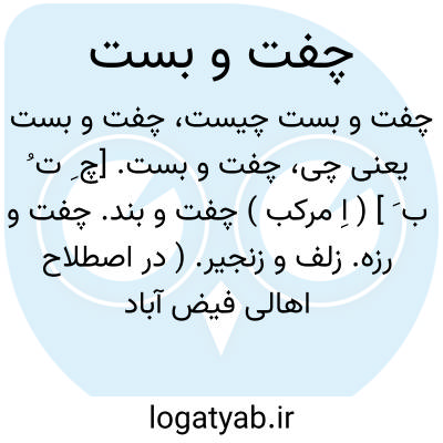 چفت و بست. [چ ِ ت ُ ب َ ] ( اِ مرکب ) چفت و بند. چفت و رزه. زلف و زنجیر. ( در اصطلاح اهالی فیض آباد بخش تربت حیدریه ).