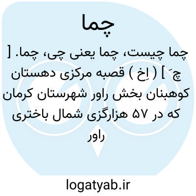 چما. [ چ َ ] ( اِخ ) قصبه مرکزی دهستان کوهبنان بخش راور شهرستان کرمان که در 57 هزارگزی شمال باختری راور کنار راه فرعی راور به کرمان واقع است. کوهستانی و سردسیر است و 3000 تن سکنه دارد. آبش از دو رشته قنات. محصولش غلات. حبوبات و لبنیات. شغل اهالی زراعت و گله داری، صنایع دستی زنان بافتن پارچه و کرباس و راهش ماشین رو است. این آبادی شعبه هائی از ادارات دولتی دارد و بنای مقبره شیخ ابوسعید که از ابنیه قدیمی است در این محل واقع است لیکن تاریخ بنا نامعلوم است. ( از فرهنگ جغرافیایی ایران ج 8 ).