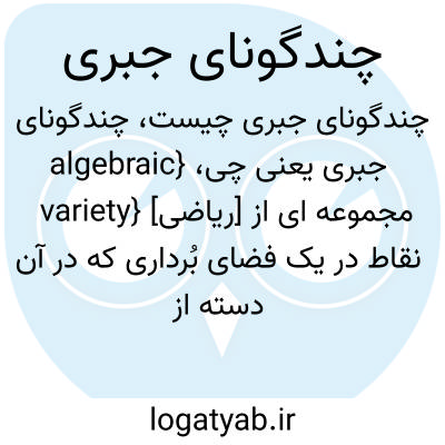 {algebraic variety} [ریاضی] مجموعه ای از نقاط در یک فضای بُرداری که در آن دسته از معادلات چندجمله ای، صدق می کند که ضرایب آنها در هیأت نرده ای فضای بُرداری باشد متـ. خمینۀ جبری algebraic manifold
