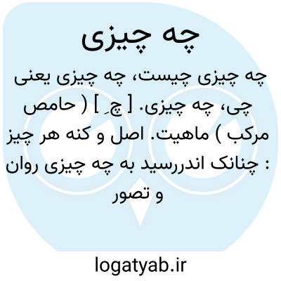 چه چیزی. [ چ ِ ] ( حامص مرکب ) ماهیت. اصل و کنه هر چیز: چنانک اندررسید به چه چیزی روان و تصور کردن وی چنانک گردیدن به نامردن روان و تصدیق کردن به وی. ( ابن سینا دانشنامه علائی ص 4 ).