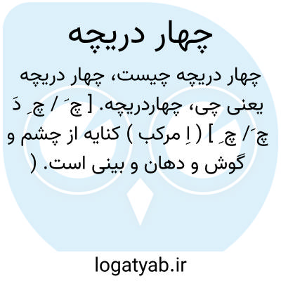چهاردریچه. [ چ َ / چ ِ دَ چ َ/ چ ِ ] ( اِ مرکب ) کنایه از چشم و گوش و دهان و بینی است. ( از شرفنامه منیری ) ( برهان ) ( آنندراج ) ( انجمن آرا ) ( ناظم الاطباء ) ( فرهنگ فارسی معین ). || کنایه از چهارعنصر است. || کنایه از کسی است که بر یک سخن نماند. ( آنندراج ) ( انجمن آرا ).