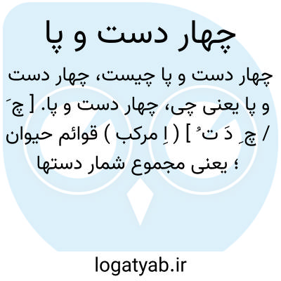 چهار دست و پا. [ چ َ / چ ِ دَ ت ُ ] ( اِ مرکب ) قوائم حیوان؛ یعنی مجموع شمار دستها و پاهای کسی یا حیوانی. دو دست و دو پای او: چهار دست و پای خود را برداشت [ سگ ] و آوازی حزین و ناله ای از او شنیده میشد. ( انیس الطالبین ص 29 ).