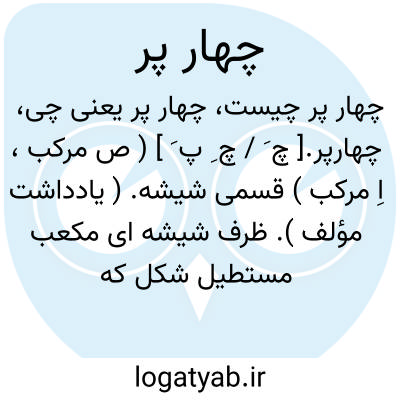 چهارپر.[ چ َ / چ ِ پ َ ] ( ص مرکب، اِ مرکب ) قسمی شیشه. ( یادداشت مؤلف ). ظرف شیشه ای مکعب مستطیل شکل که آب یا نوشابه را بکار دارند. || چهارپهلو. || دارای چهارپره. || قسمی چماق که بر سرآن آهنی گنده و چهارپر است. ( یادداشت مؤلف ). || دارای بال برای پریدن. رجوع به چارپر شود.