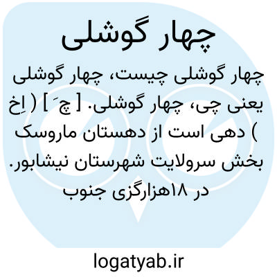 چهار گوشلی. [ چ َ ] ( اِخ ) دهی است از دهستان ماروسک بخش سرولایت شهرستان نیشابور. در 18هزارگزی جنوب باختری چکنه بالا. معتدل و کوهستانی است. 179 تن سکنه دارد. از قنات آبیاری میشود. محصولش غلات و شغل اهالی زراعت است. ( از فرهنگ جغرافیایی ایران ج 9 ).