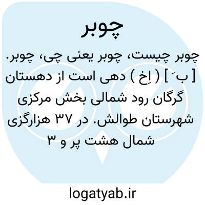 چوبر. [ ب َ ] ( اِخ ) دهی است از دهستان گرگان رود شمالی بخش مرکزی شهرستان طوالش. در 37 هزارگزی شمال هشت پر و 3 هزارگزی شمال حویق سر راه شوسه ٔآستارا واقع شده است. جلگه و مرطوب است. 1725 تن سکنه دارد. از چشمه و رودخانه آبیاری میشود. از محصولاتش غلات، لبنیات، عسل، چای، گیلاس، سیب و پرتقال است. مردمش بکشاورزی اشتغال دارند. سر راه شوسه 5 قهوه خانه و چند دکان دارد. ( از فرهنگ جغرافیایی ایران ج 2 ).